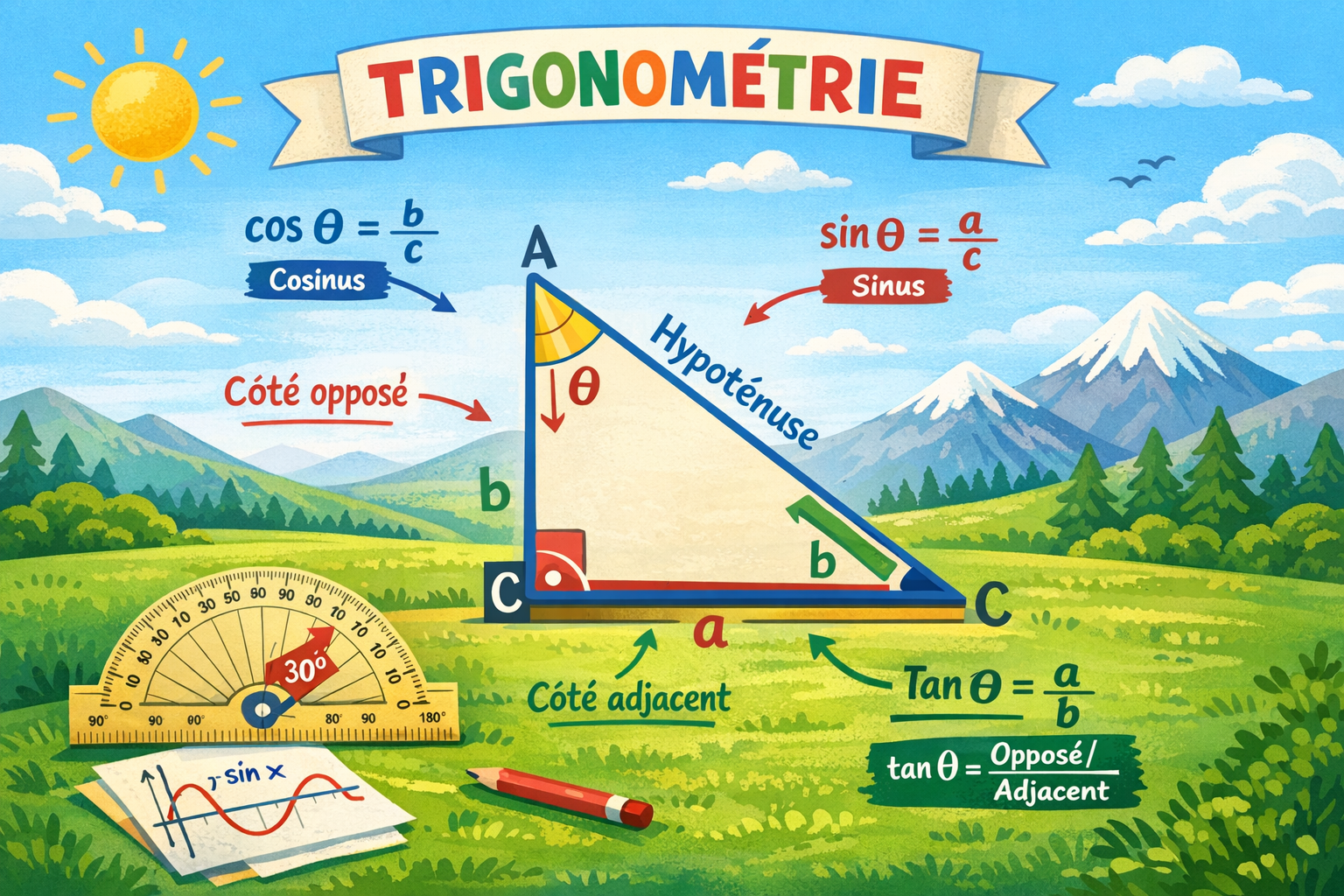 La trigonometrie permet de calculer des longueurs et des angles dans un triangle rectangle a l'aide du cosinus, du sinus et de la tangente. C'est un chapitre majeur du brevet.